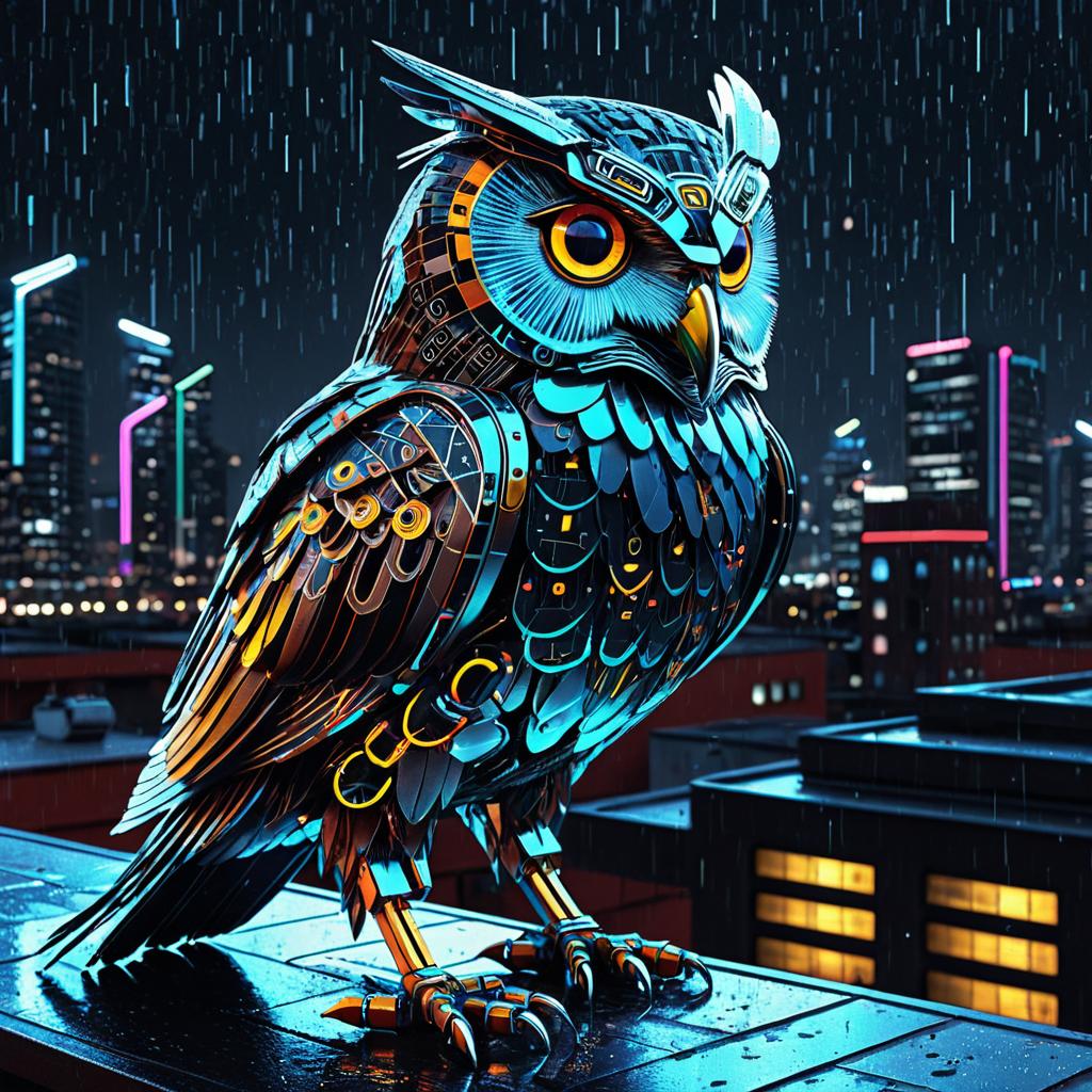 A high-tech artificial bird in photorealistic digital art style, featuring a sleek cyber owl with illuminated circuitry patterns on its wings, with smooth reflective chrome feathers and a pulsating holographic eye shaped like a data network symbol, set in a dark urban rooftop at night with rain-soaked surfaces reflecting multicolor neon lights, 8K resolution