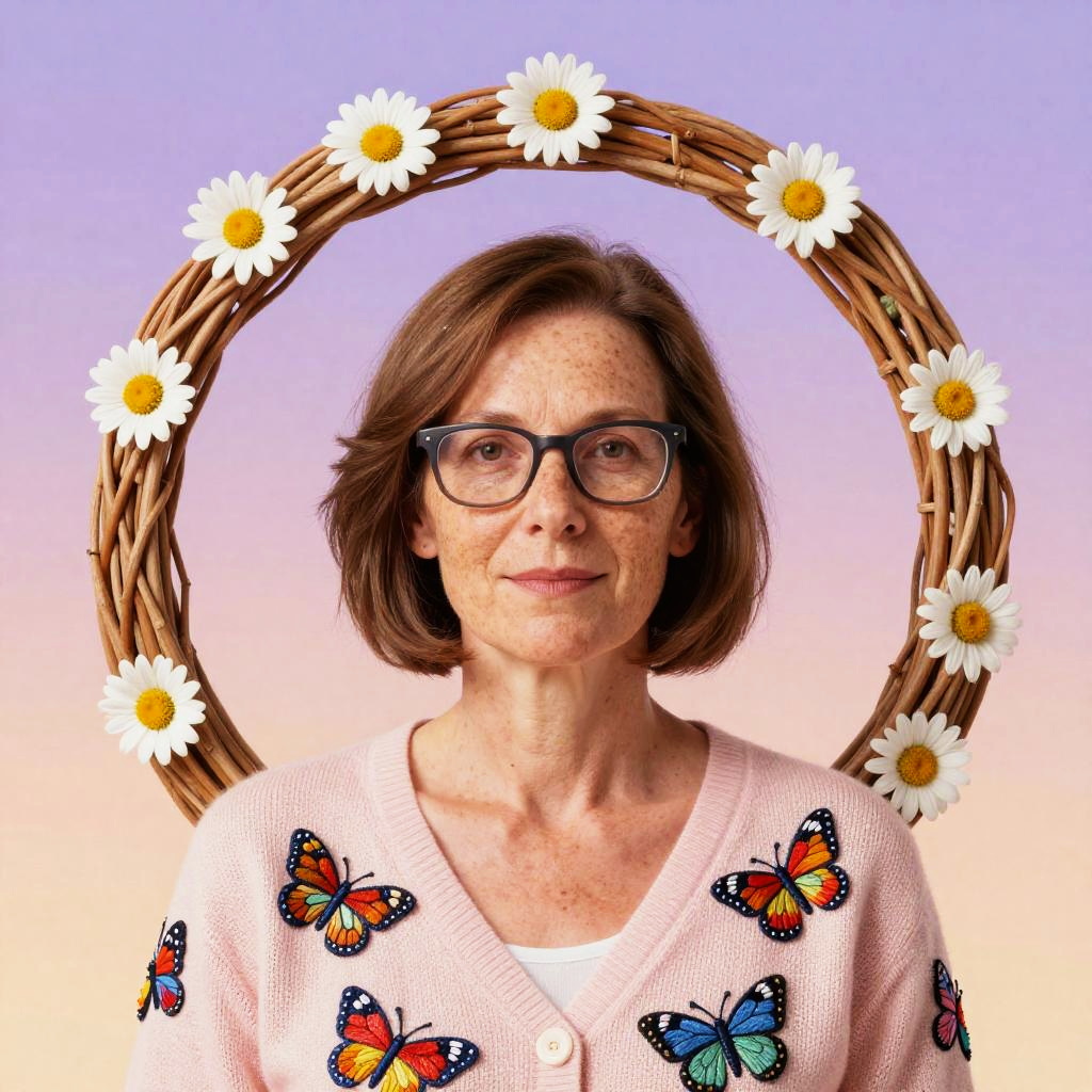 Photograph of a middle-aged woman with short brown hair and freckles, wearing black-rimmed glasses and a white knitted cardigan adorned with colorful butterfly embroidery. She stands against a gradient background of soft pink and blue. A circular, woven wreath decorated with white daisies frames her head from behind. The image has a bright, cheerful aesthetic, with the butterflies and daisies adding a playful touch. The woman's expression is calm and gentle, and the overall composition is balanced and harmonious.