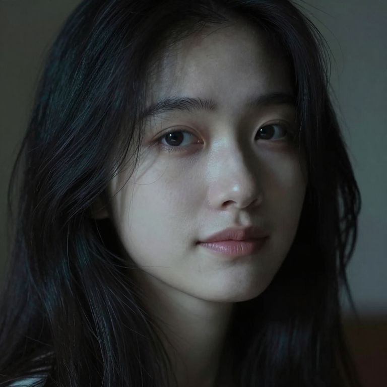 A photograph of a young Asian woman with fair skin and long, dark brown hair, parted slightly to the side. She has large, dark eyes, subtle eyebrows, and a small, slightly upturned nose. Her lips are closed with a faint, neutral expression. The lighting is cool and dim, casting soft shadows and highlighting her facial features with a bluish tint. The background is blurred, dark, and indistinct, keeping the focus on her face. The overall mood is introspective and serene.