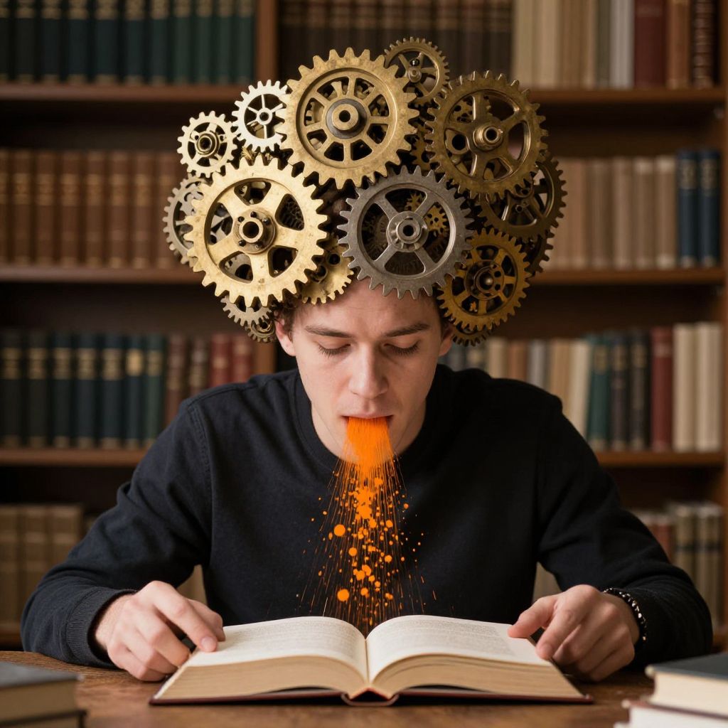 Man engrossed in reading, surrounded by a swirling crown of golden and metallic gears above his head, as vibrant orange particles cascade down from his mouth onto an open book resting on a wooden table, set against the backdrop of a bookshelf filled with neatly arranged volumes.