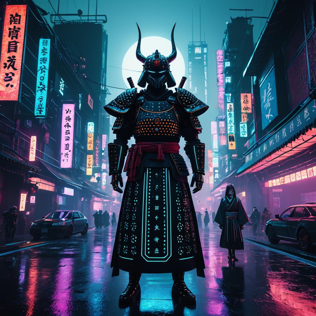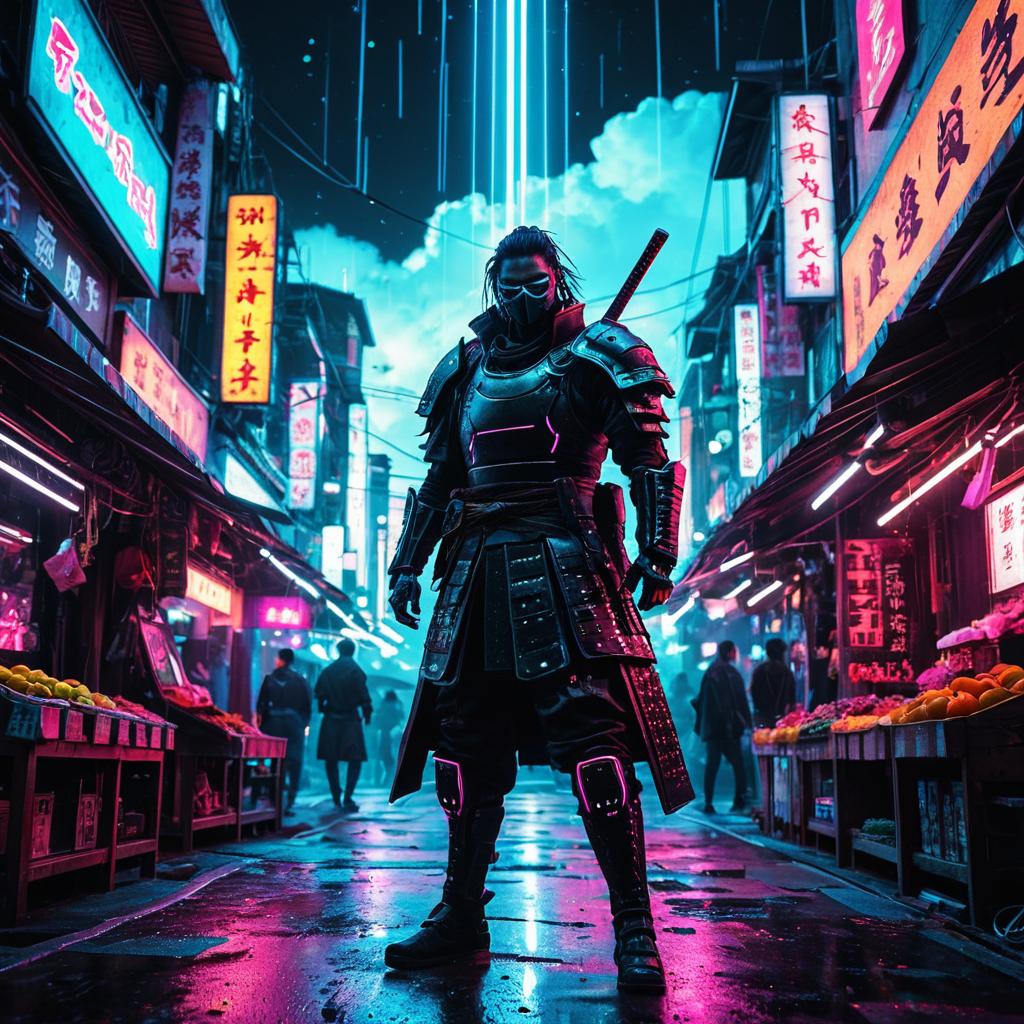 A stealthy cyber samurai, wearing a futuristic armor with glowing katana sheath, standing in a rain-soaked neon marketplace at night, surrounded by reflected neon puddles and sparking connectors, drawn in the dramatic and action-packed style of Masakazu Katsura.