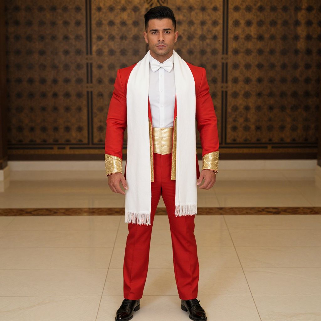 A man wearing a red and gold outfit with a white scarf and a white bow tie, standing on a tiled floor with a patterned wall behind him. The man has a muscular build, well-defined features, and a confident expression. His red and gold attire is formal and elegant, complementing his sophisticated demeanor. The white scarf and bow tie add a touch of refinement to his appearance. The tiled floor and patterned wall create a stylish and decorative environment that enhances the overall aesthetic of the scene.