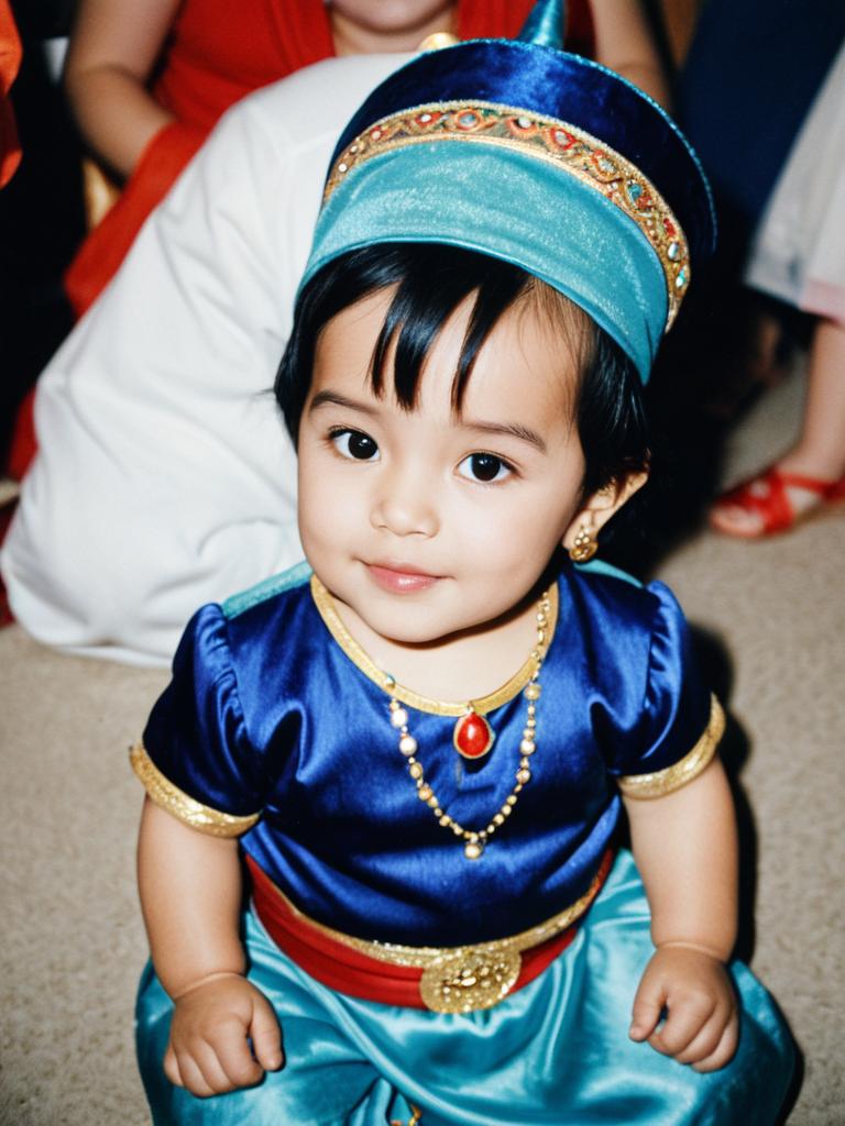 Close-up portrait of a cheerful toddler wearing a vibrant blue and gold Aladdin costume with intricate patterns and a matching headpiece with red and gold accents. The child has dark hair and expressive dark eyes, smiling warmly.