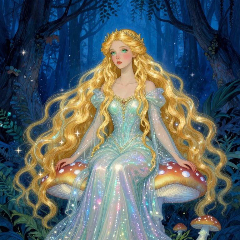 Digital art depicts a fairytale princess with long, wavy blonde hair and green eyes, wearing a shimmering, iridescent gown with off-the-shoulder sleeves. She sits on large, red-and-white-spotted mushrooms in a mystical, dark blue forest illuminated by twinkling stars. Her golden crown matches her hair, and the gown's light reflects sparkles. The forest background is dense with trees and foliage, creating a magical, ethereal atmosphere. The image has a fantasy, whimsical style with vibrant colors and detailed textures.