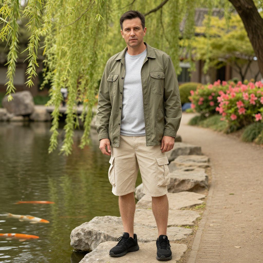 A man, light gray performance t-shirt, olive green field jacket, beige cargo shorts, black athletic shoes, standing by a serene koi pond, willow trees draping, colorful azaleas lining the path, soft focus, warm tones, relaxed expression. Man has masculine face and piercing eyes