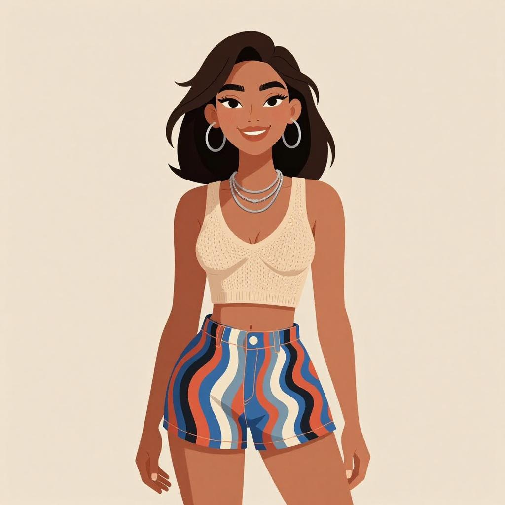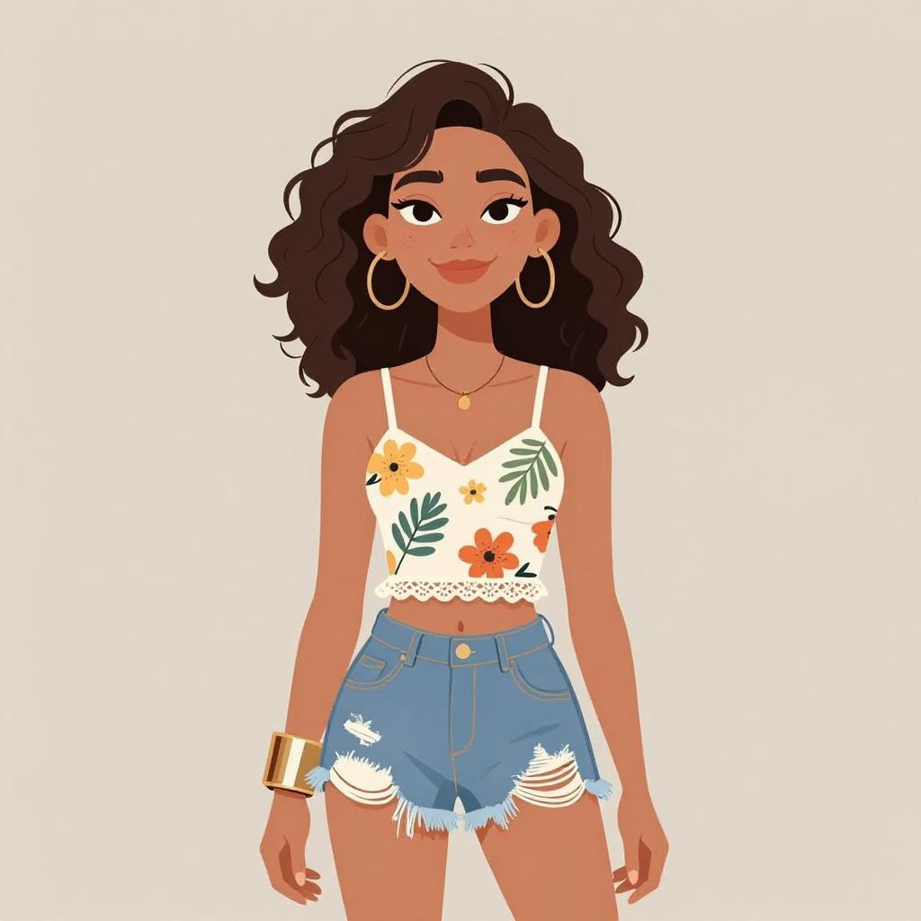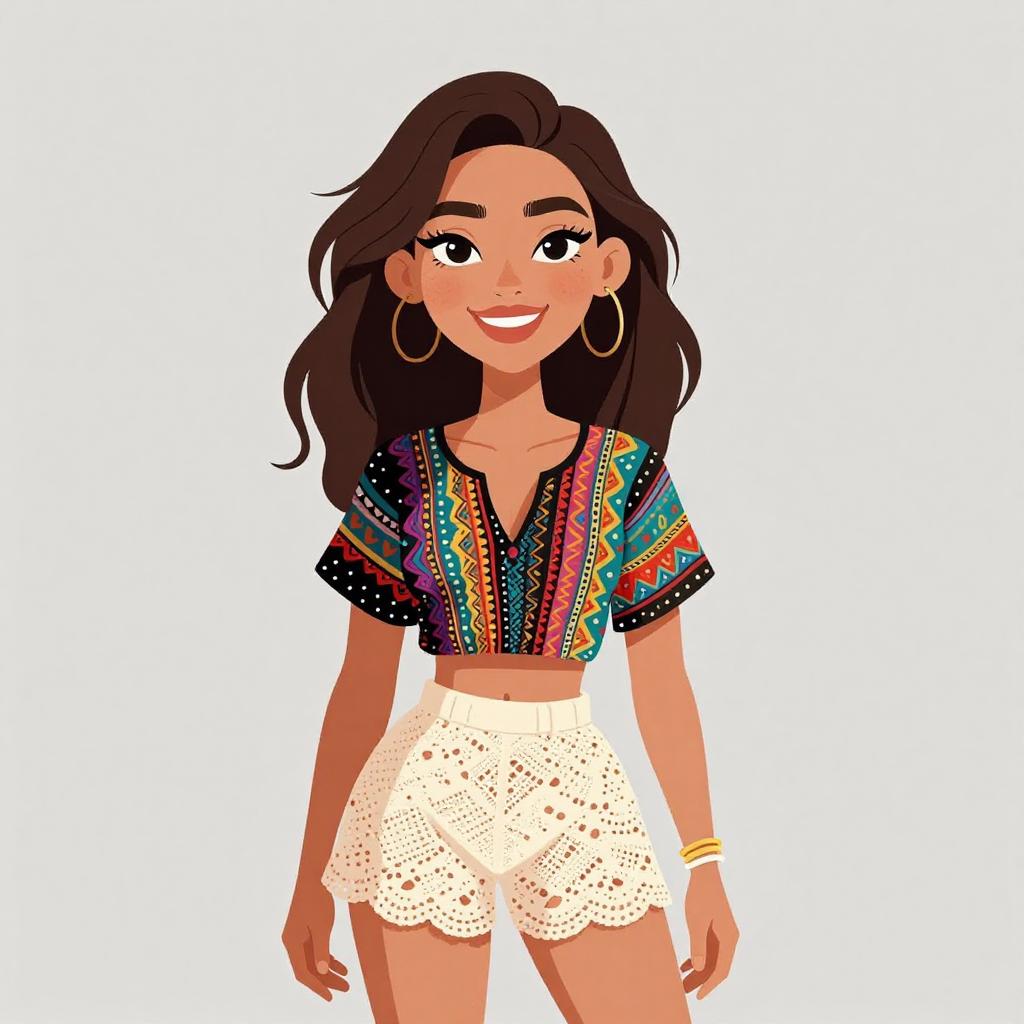 Woman with pretty face and pretty hair. smiling Woman, bohemian style, crochet tank top with multicolored floral pattern, scoop neck, sleeveless, scalloped hem, khaki shorts, mid-thigh length, flat-front waistband, casual black straps on shoulders, assorted bracelets, plain white background. --sref 1467