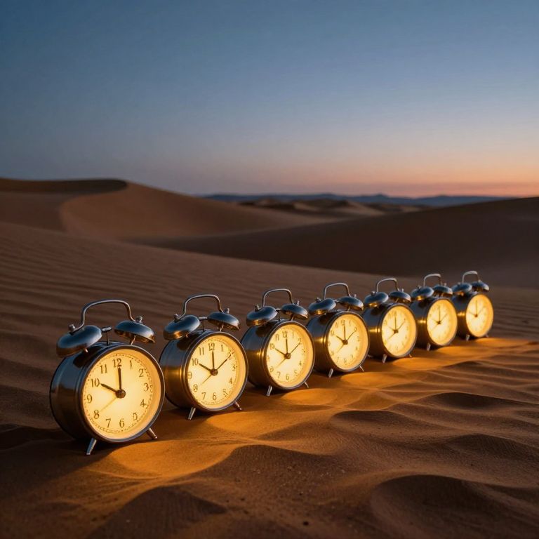 Glowing alarm clocks rest in a row atop golden sand dunes, their illuminated faces casting warm light as they stretch into the horizon under a twilight sky.