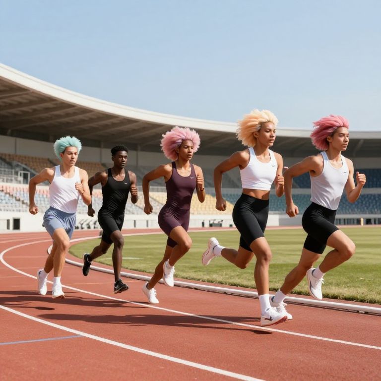 Athletes with vibrant, pastel-colored hair and eclectic outfits sprint energetically along a curved track, their synchronized strides creating a visually striking display of motion against a backdrop of clear skies and stadium seating.