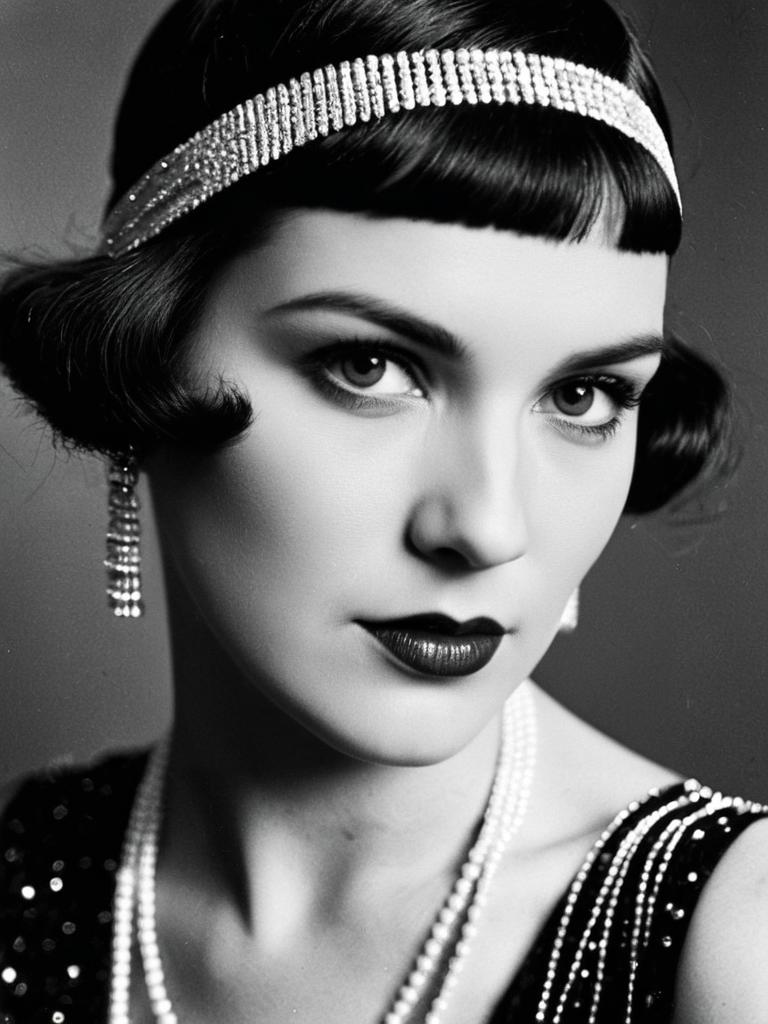 Woman in Flapper Dance costume, photorealistic close-up headshot