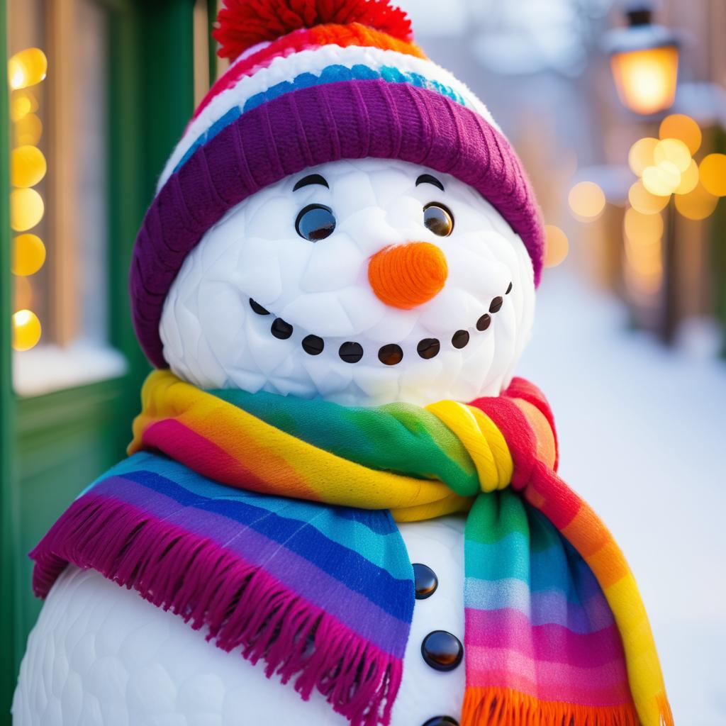 Close-up of a snowman wearing a colorful scarf, portrait mode, soft holiday ambiance.