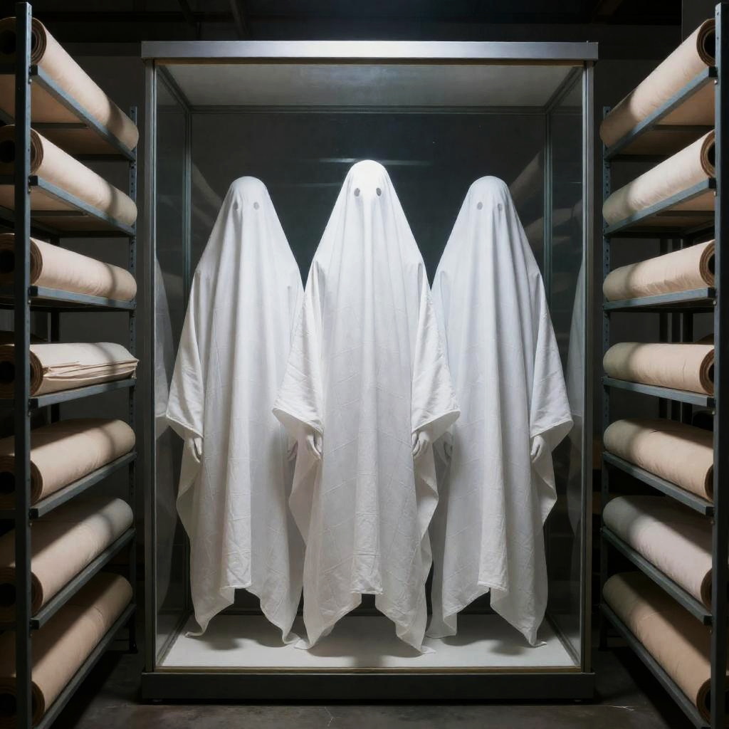 Photograph of three ghost-like figures in white and checkered cloaks, standing in a glass-walled display case. Flanked by tall metal racks filled with beige fabric rolls. Dimly lit, industrial setting. Figures have simple, featureless faces.