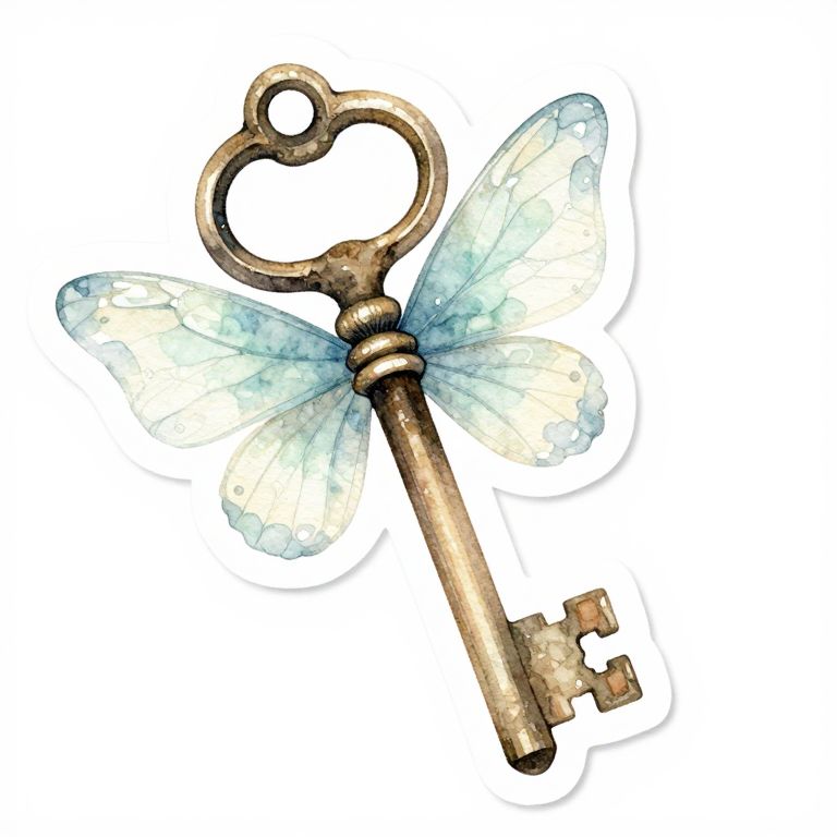 Stenciling a watercolor of an old decorative key with gossamer bug wings, white background, sticker,