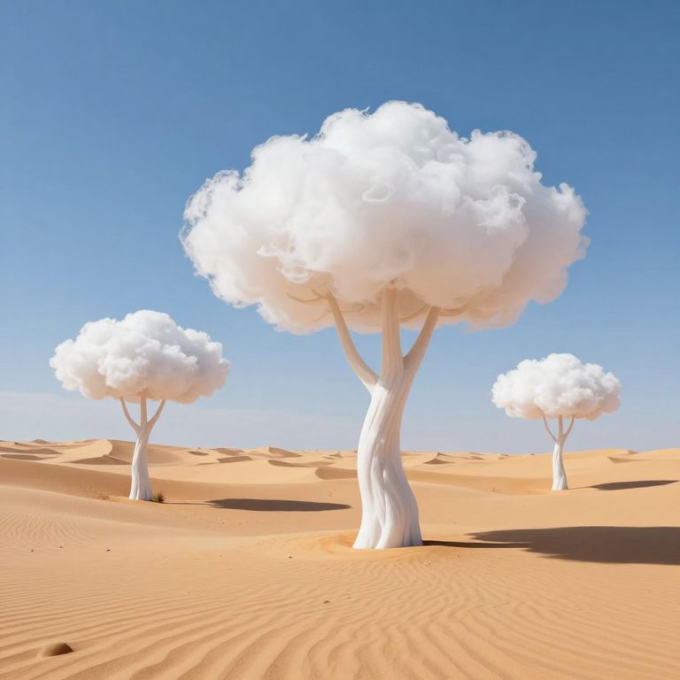 Digital artwork of surreal white cloud-trees with fluffy, cloud-like canopies in a bright blue sky over sunlit, rippled desert sand.
