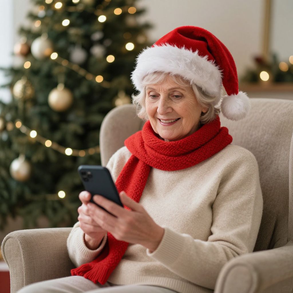 Elderly woman sitting comfortably in a cozy chair, wearing a festive red Santa hat and scarf, while holding a smartphone and smiling warmly, with a beautifully decorated Christmas tree illuminated by golden lights in the background.