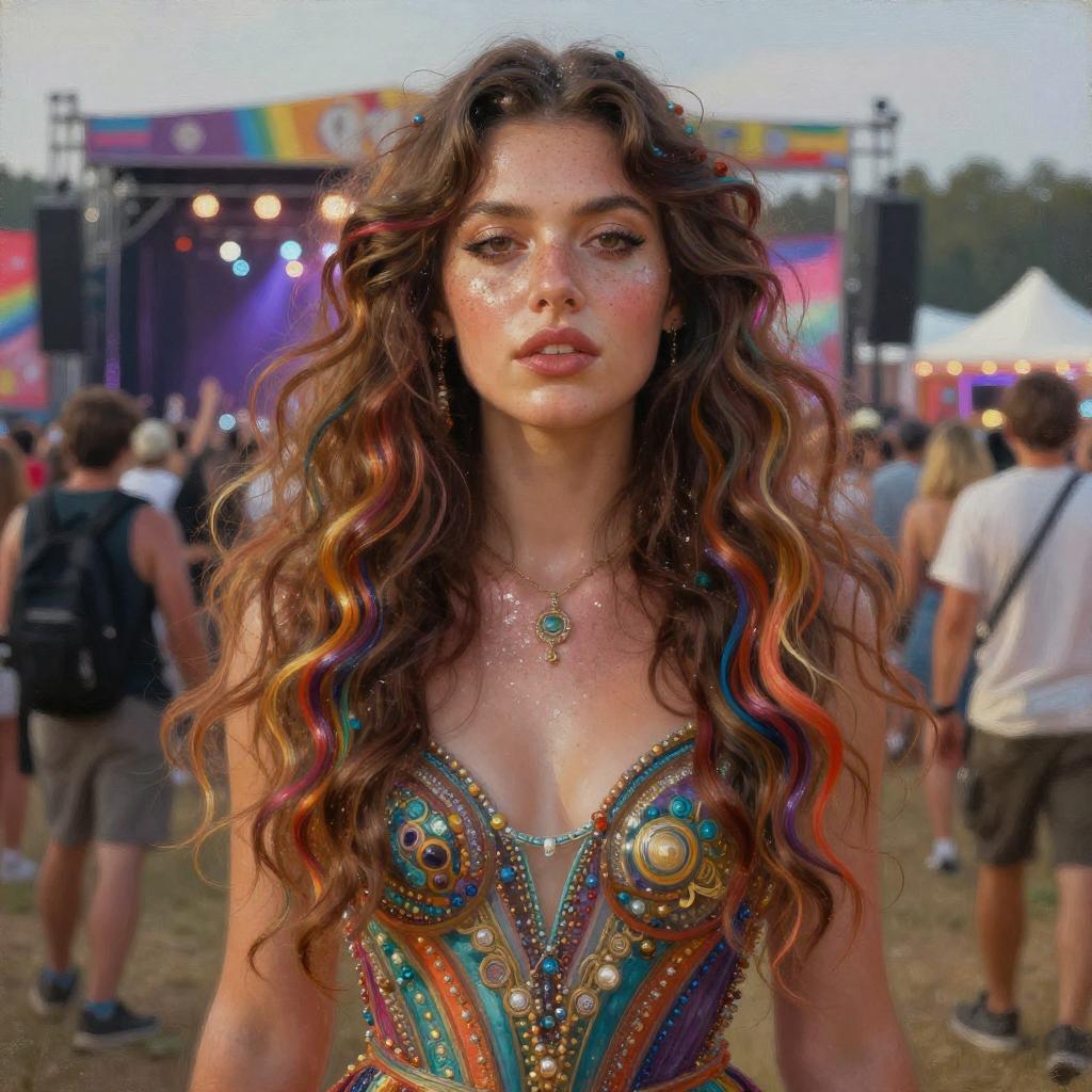 GIL ELVGREN photorealistic painting ((full body)) portrait of ((stunningly attractive)) a woman at a music festival, ((perfect feminine face)), (+long colorful wavy hair), (+glitter freckles), glitter, wearing a dress, intricate, 8k, highly detailed, volumetric lighting, digital painting, intense, sharp focus, art by artgerm and rutkowski and alphonse mucha, cgsociety