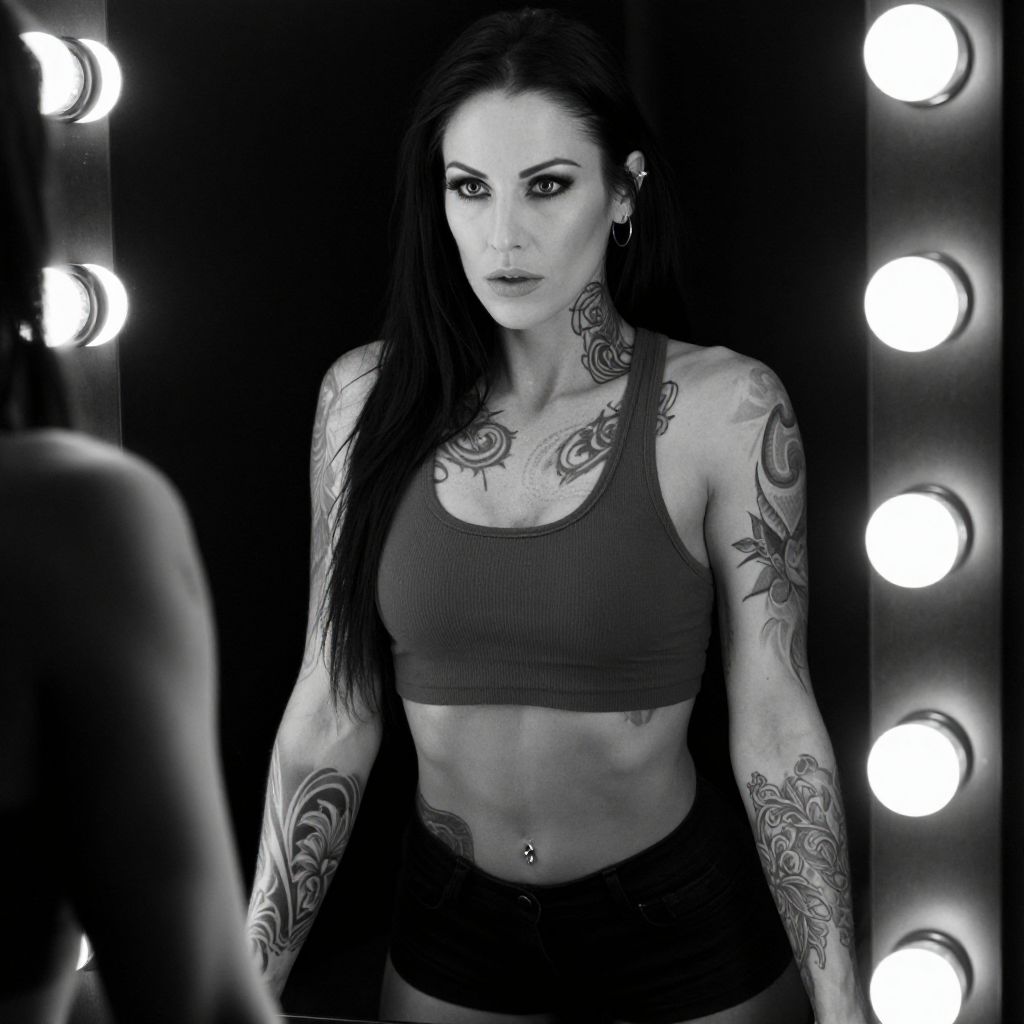Black-and-white photo of heavily tattooed woman with dark hair, large earrings, black top, plaid shirt, arms crossed, intense gaze.