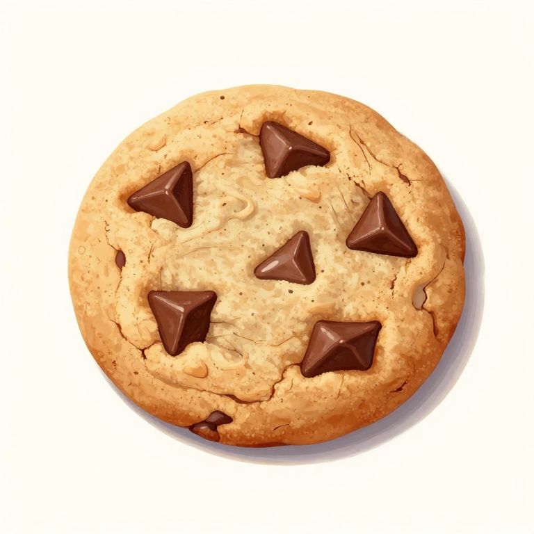 This is a digital illustration of a round, golden-brown chocolate chip cookie with a slightly cracked surface. The cookie is topped with five triangular, dark brown chocolate chips evenly spaced across its surface. The texture of the cookie is detailed, showing a slightly rough and uneven surface with small cracks and a lightly browned edge. The background is completely white, making the cookie the sole focus of the image. The lighting highlights the cookie's texture and the glossy surface of the chocolate chips, creating a realistic and appetizing appearance.
