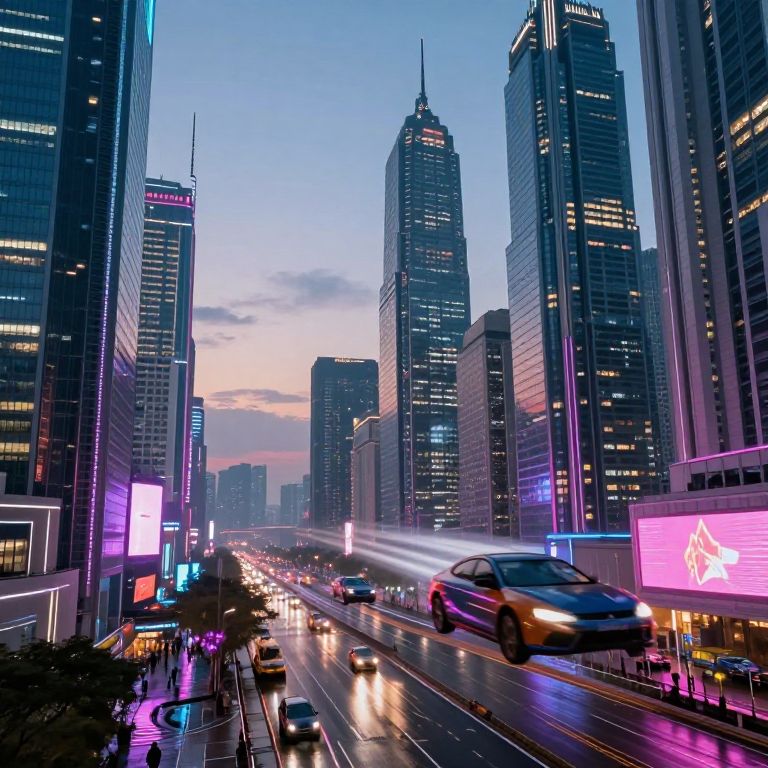Bvs futuristic cityscape at dusk, neon lights reflecting on wet streets, flying cars zooming past towering skyscrapers, a blend of cyberpunk and modern architecture, vibrant colors, detailed environment