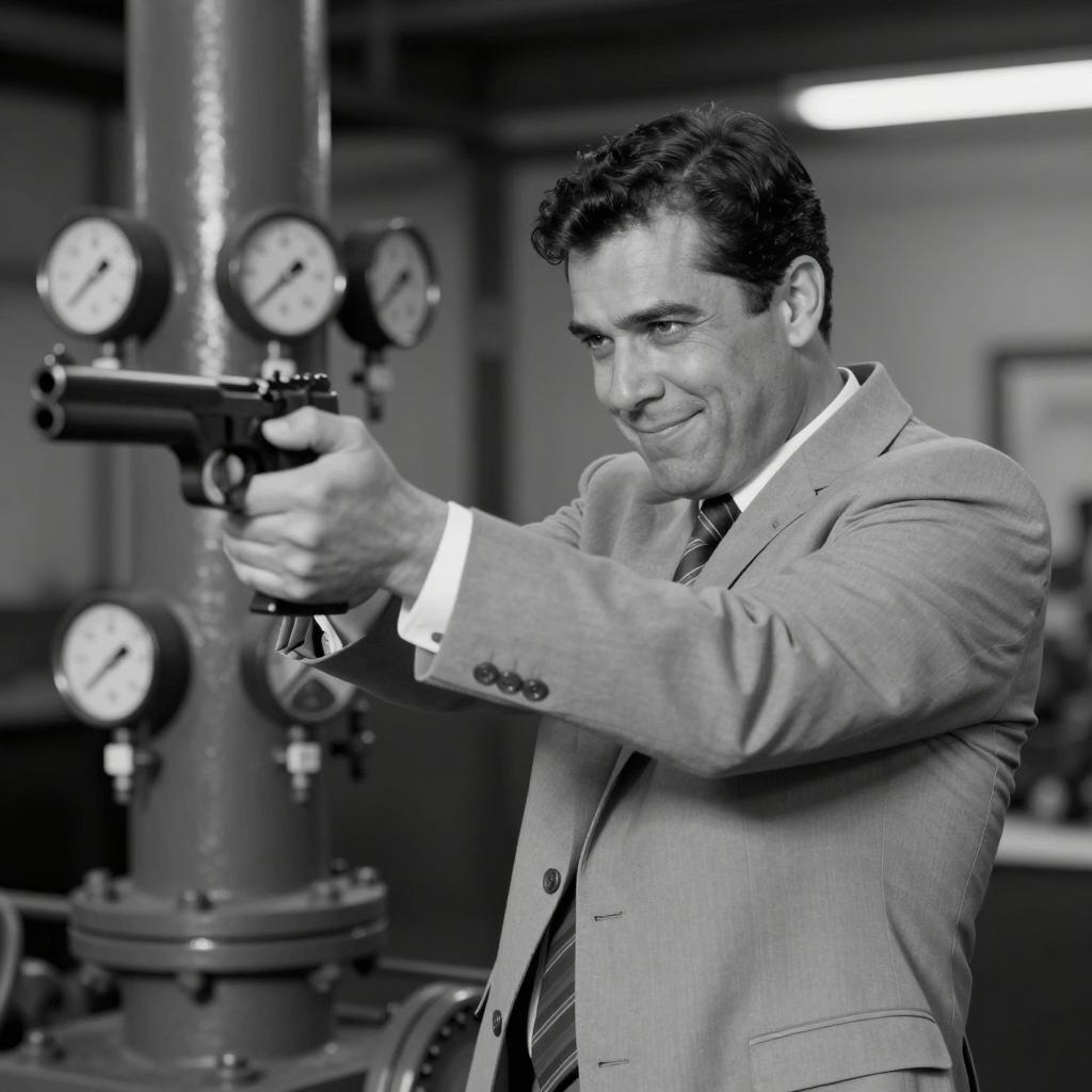 Black and white photograph of a man with short dark hair, wearing a light-colored suit and tie, aiming a gun forward. Background includes industrial equipment with multiple round gauges and a large pipe. Man has focused expression, slightly smiling. His right arm extends forward, gripping the gun with a firm hold. Two visible buttons on his suit jacket. Industrial setting with metal ures and shadows.
