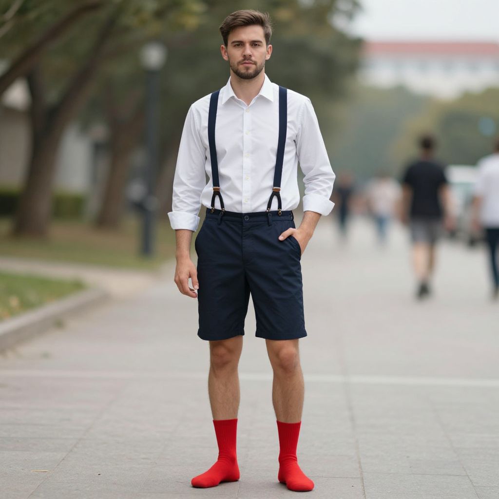 "show adult costume, 1boy, male focus, outdoors, shirt, looking at viewer, brown hair, solo, red socks, hand in pocket, blurry background, full body, shorts, collared shirt, blurry, day, standing, facial hair, socks, suspenders"