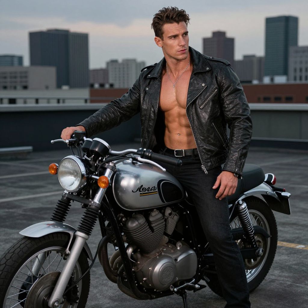 Buff muscular man posing on a vintage motorcycles, leather jacket open revealing his chiseled torso, urban rooftop background with city skyline at dusk, moody lighting, mix of rugged masculinity and modern street style.
