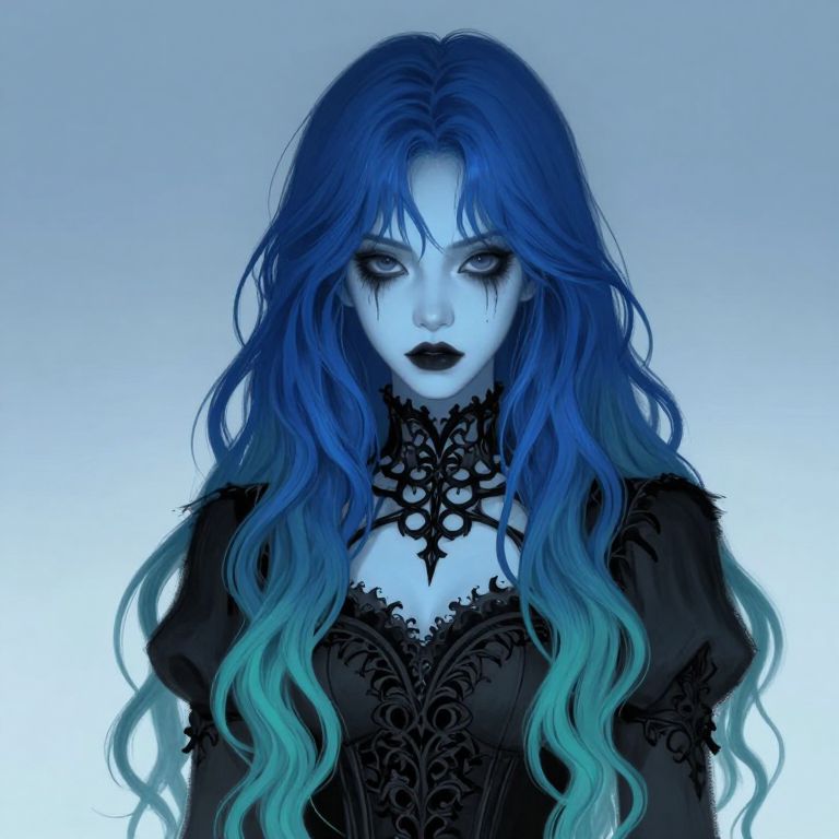 Digital artwork of a pale, blue-skinned woman with long, wavy hair that transitions from deep blue at the roots to teal at the tips. She has striking black lipstick, dark, smoky eye makeup, and a gothic black lace choker with intricate patterns. She wears a black, Victorian-style dress with lace detailing. The background is a gradient of light to dark blue, enhancing her ethereal, mysterious appearance. The overall style is gothic and fantasy-inspired, with a focus on dramatic color contrasts and detailed textures.