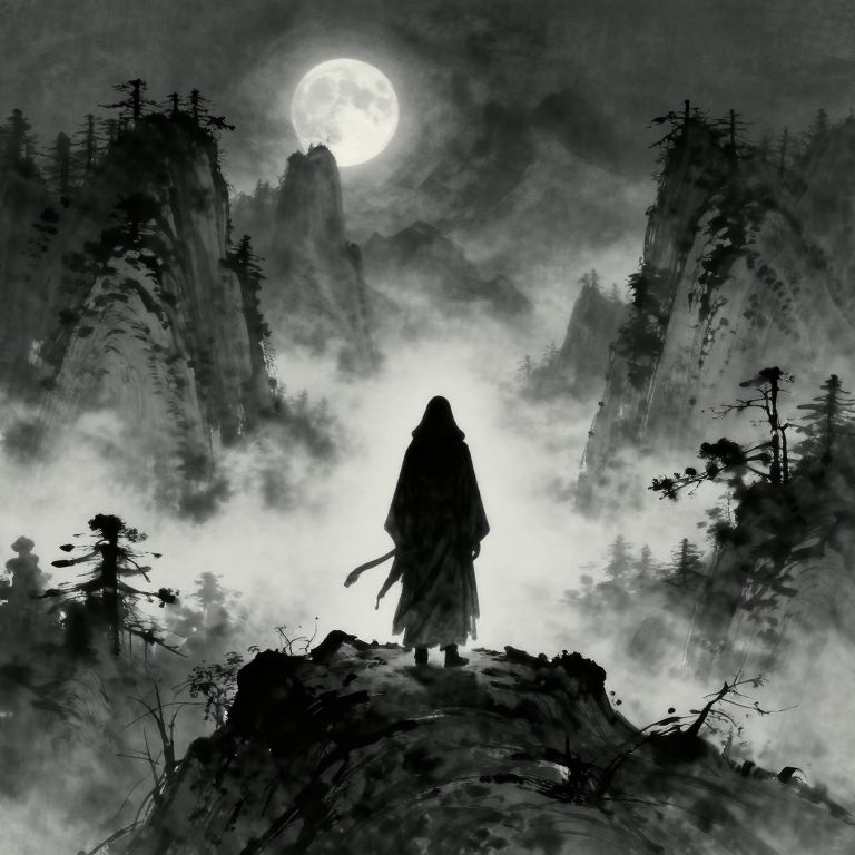A thought-provoking digital artwork portrays a lone figure shrouded in darkness, positioned atop a foggy mountain summit overlooking an enigmatic, moonlit woodland. The scene harmoniously blends traditional ink painting methods reminiscent of Chinese landscapes with modern gothic motifs, creating a serene yet foreboding atmosphere. From a first-person viewpoint, observers feel as though they are standing alongside the mysterious character, sharing in their silent observation while experiencing the profound emotions elicited by this awe-inspiring yet unsettling panorama.