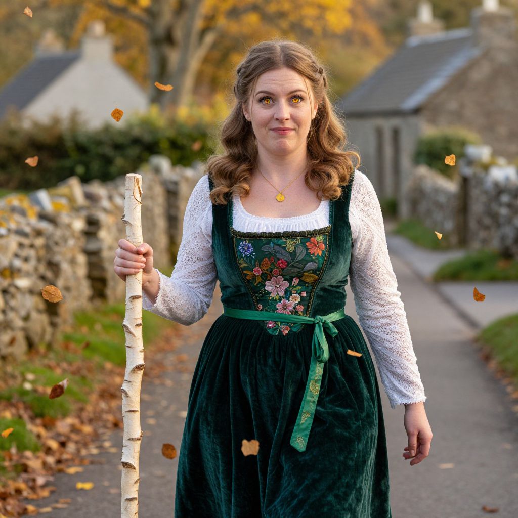 A vividly detailed outdoor scene showing a woman in a handcrafted Irish Celtic maiden costume — green velvet dress with a floral bodice, a lace undershirt, and a green sash — walking along a stone path in a rural Irish village during autumn, golden leaves falling around her, her face is soft and kind with warm amber eyes and a slightly smug, playful expression, eyes catching the afternoon light as she carries a small staff made of birch wood. The woman has big tits and cute face