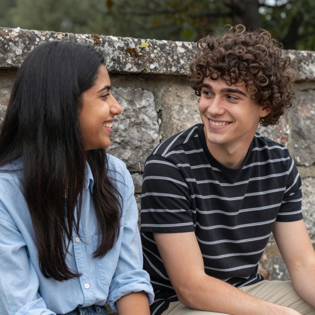 Photograph of three people on a boat. Two seated in front, one with curly hair, light sweater, and gray pants, the other with dark hair, black shirt, and dark pants, gesturing. One person seated in background with dark hair, black shirt, and brown bag. White boat with ropes, anchor, and small plate with snacks. Bright daylight.