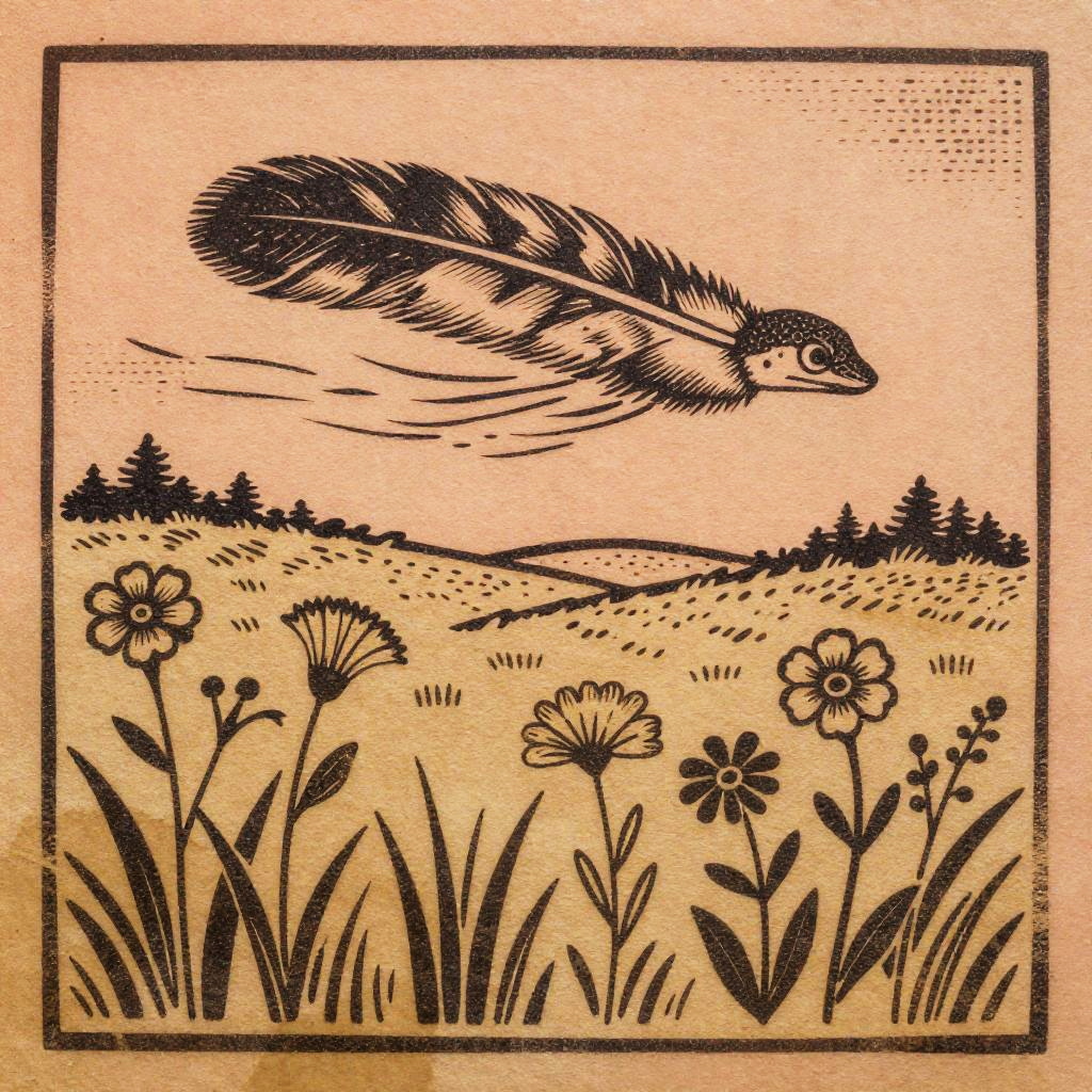 A detailed woodcut print-style illustration of a set of carpenter bees buzzing near an old beehive, set in a sun-dappled orchard filled with apple trees, rendered as folk art linocut with rustic textures, minimal geometric forms, bold gouge lines, crosshatching, and generous negative space; uneven inking and hand-carved imperfections on weathered fiber paper; decorative border ornaments, subtle paper grain, vintage bookplate aesthetic; limited bright ochre and moss green palette; tactile relief print feel and a calm, timeless mood