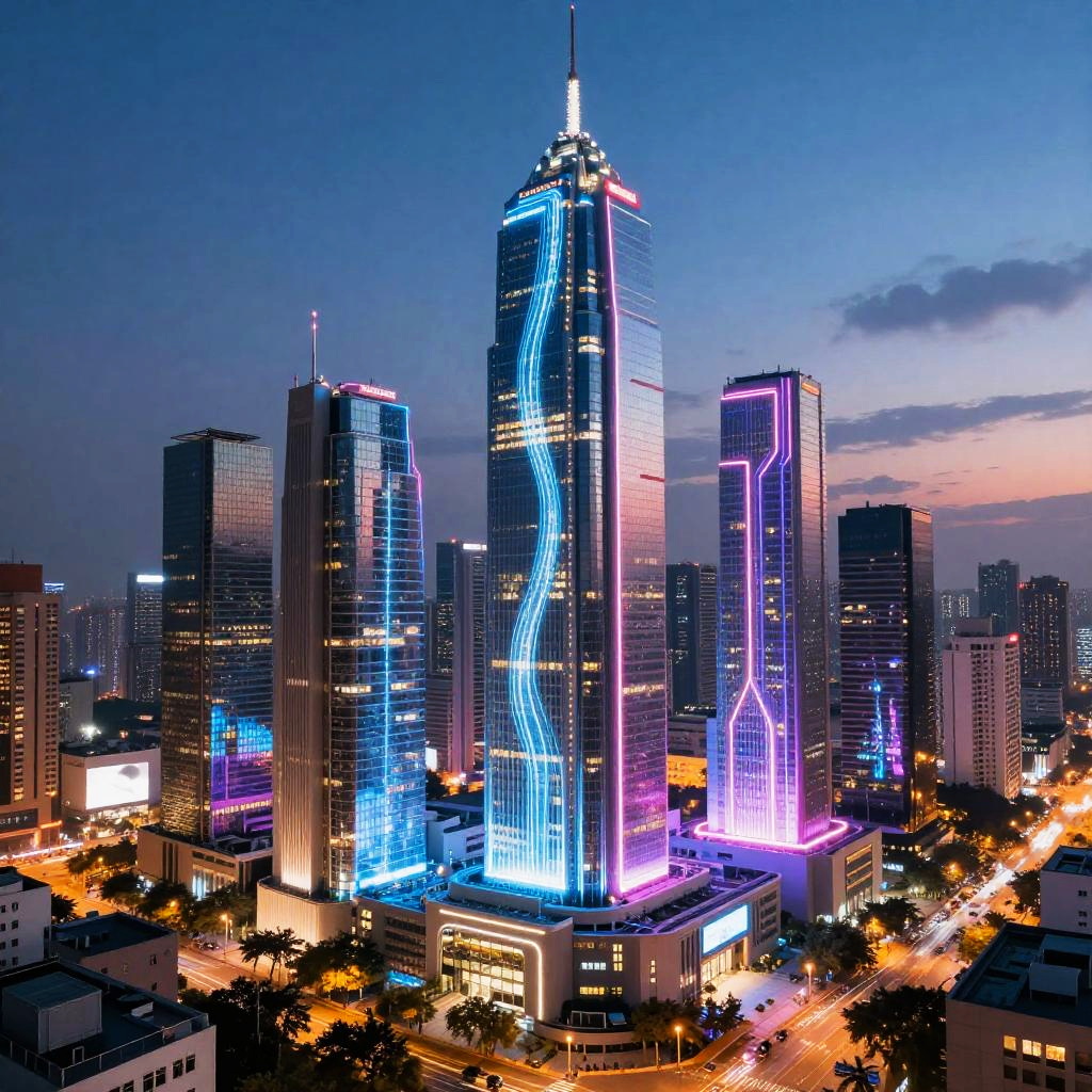 Stabledifusion represented as a futuristic city powered by advanced energy flow, neon-lit buildings with transparent walls, energy currents visually seen surrounding and stabilizing the infrastructure, dynamic and vibrant urban scene at dusk with a digital atmosphere