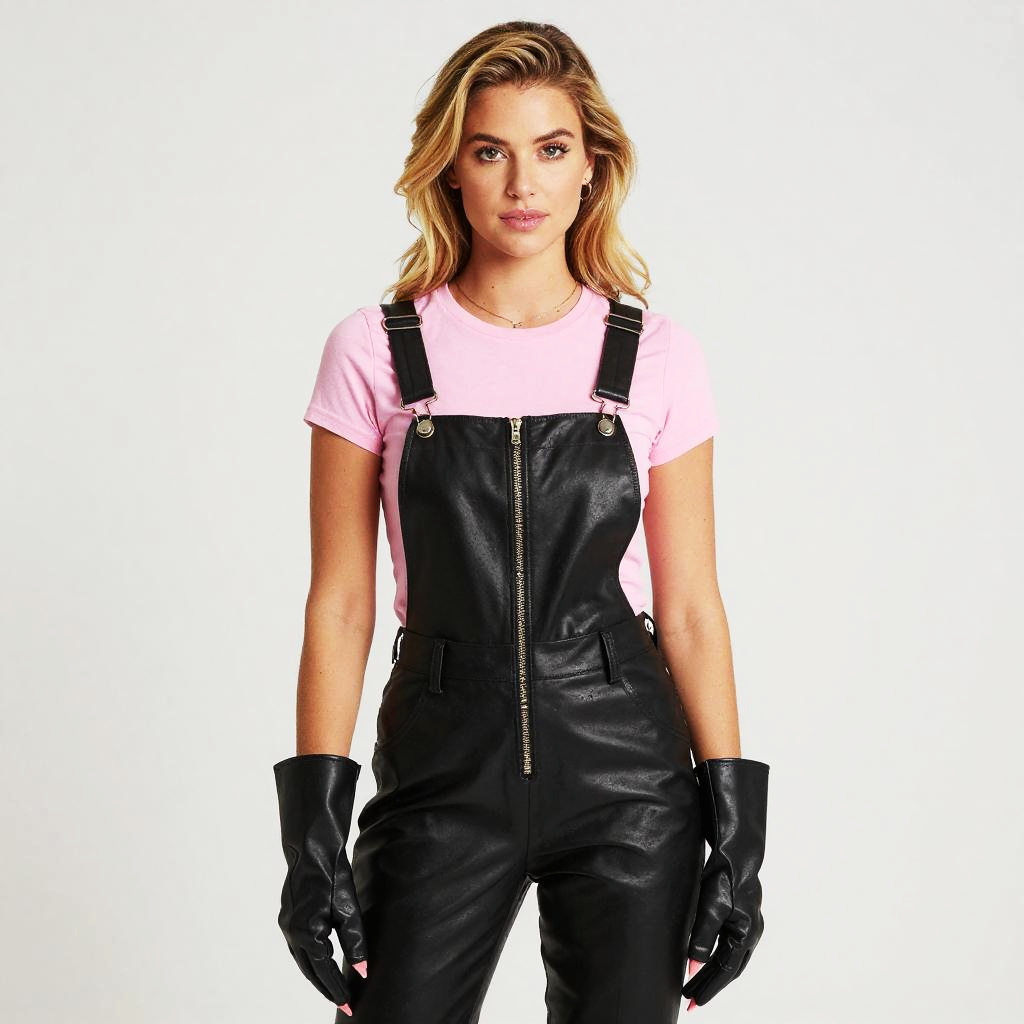 Pig Front Hooves Costume Gloves, blond woman in a pink shirt and black leather overalls posing for a picture