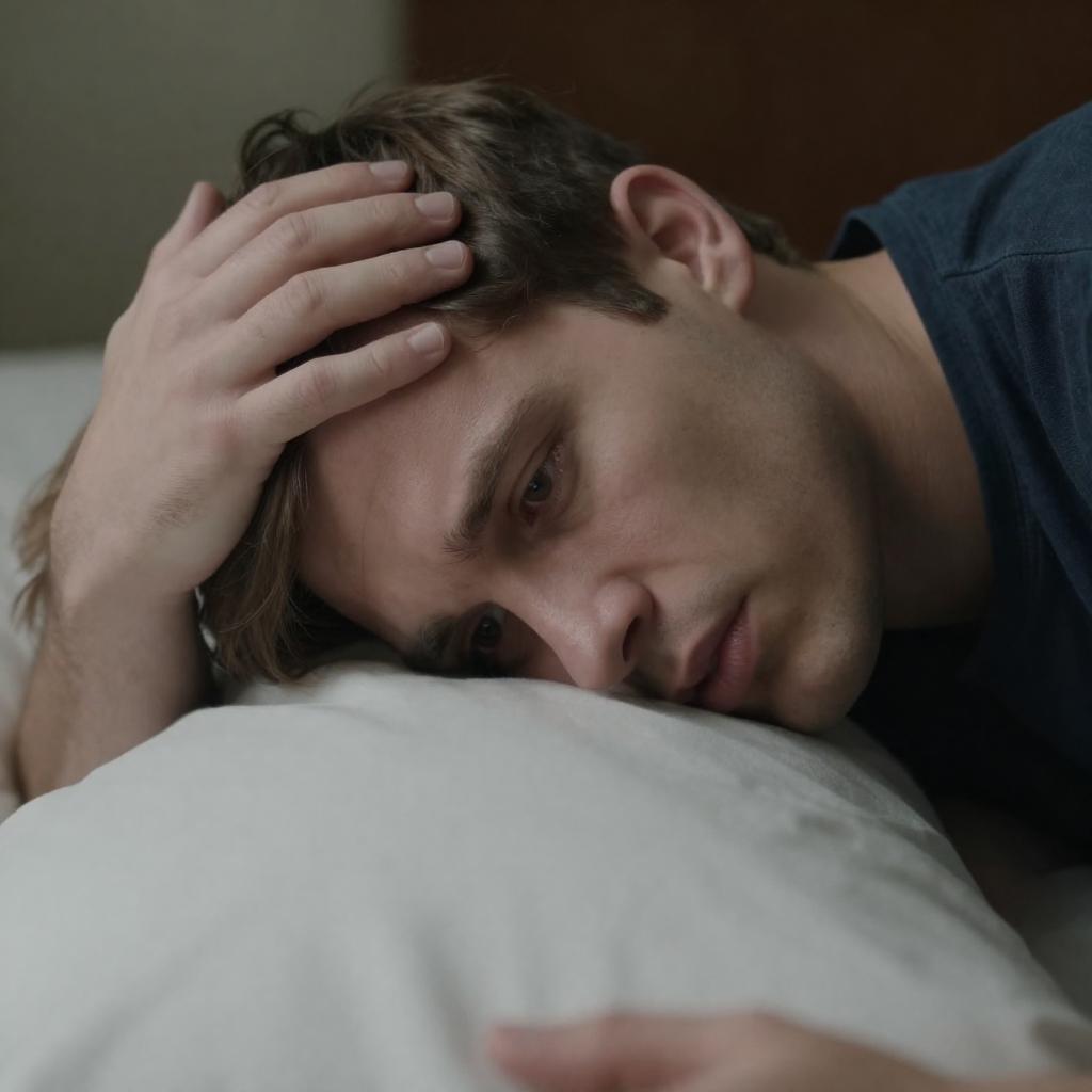 Photograph of a close-up scene showing a man with short brown hair and a concerned expression, lying on the ground with his head close to another person's shoulder. The blurred white foreground contrasts with the man's focused gaze. His hand rests gently on the other person's head. The background is dark and indistinct.