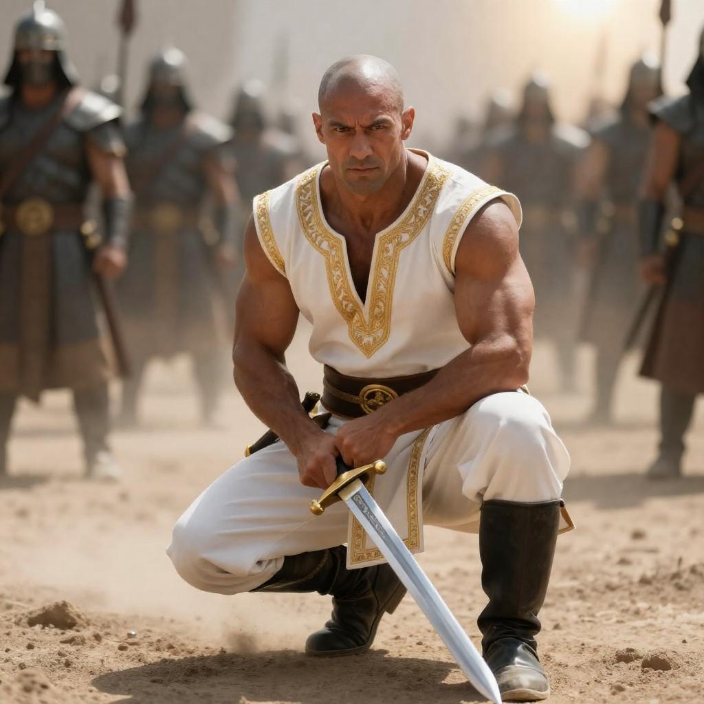 A muscular, bald man with a tan complexion, wearing a gold-embroidered white tunic and black boots, crouches on dusty ground, gripping a silver sword with a gold hilt. In the background, a blurred army of similarly dressed warriors stands, creating a battle scene. Sunlight illuminates the scene from the top right.
