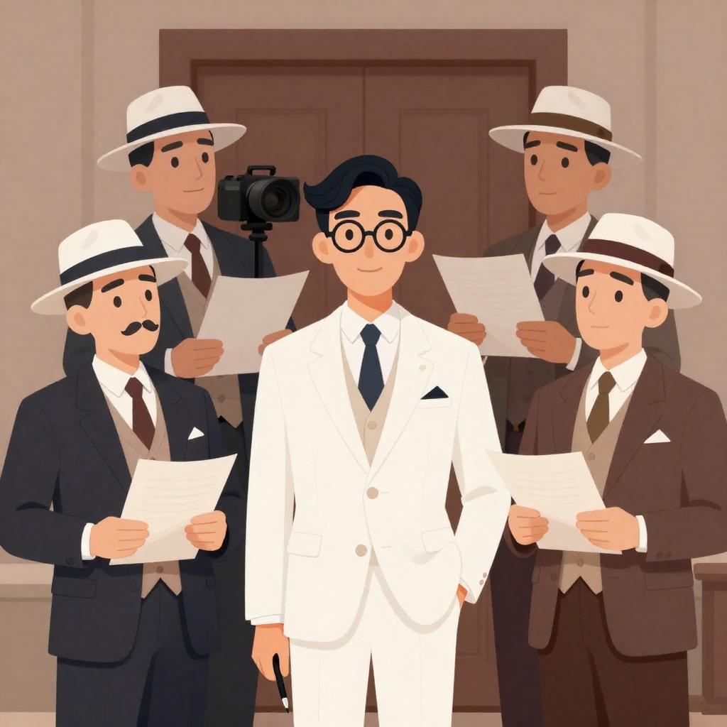 Digital illustration of six anthropomorphic men in 1930s-style clothing. Central figure in white suit, black-haired man with glasses, and two men in white hats stand in front. Camera-wielding man in background. All holding papers, pens. One man with mustache, another with thoughtful expression. Background: wooden door and brown wall.