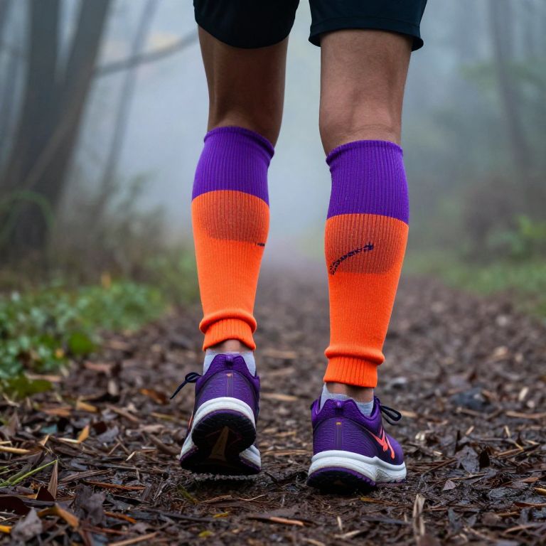 Athletic leg warmers and sneakers running on forest trail, early morning light, misty atmosphere, vibrant purple and orange leg warmers, high performance sneakers, nature fitness theme