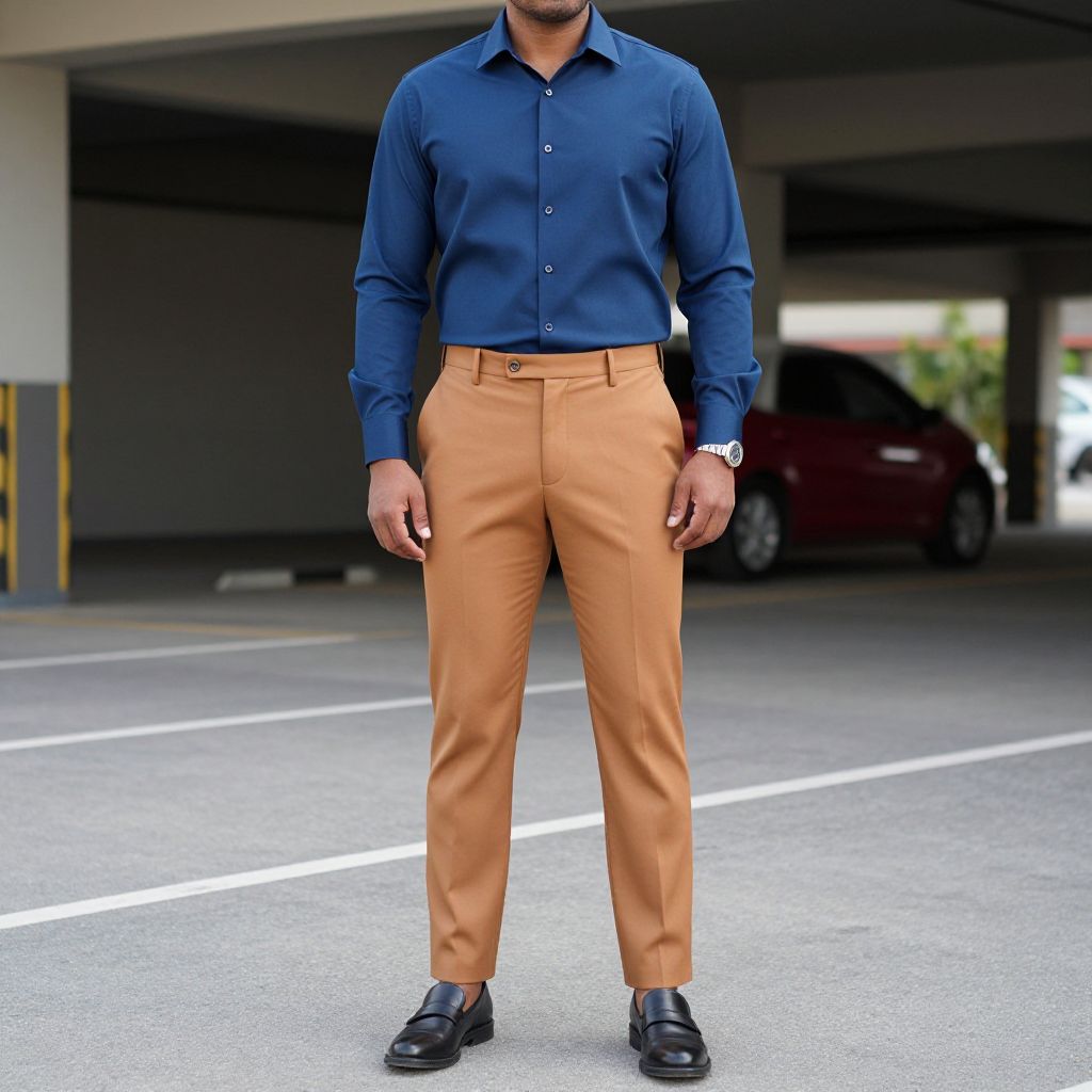 Stylish Pants Costume, man standing in a parking lot with a blue shirt and tan pants
