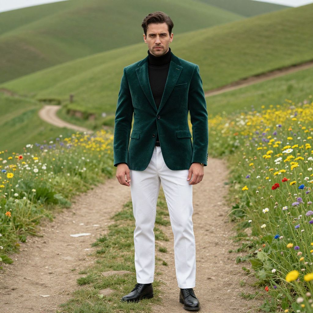 A man, emerald green velvet jacket, classic black turtleneck, slim fit white trousers, black oxford shoes, lush green hills, winding dirt paths, vibrant wildflowers, cinecolor, confident expression Man has masculine face and piercing eyes