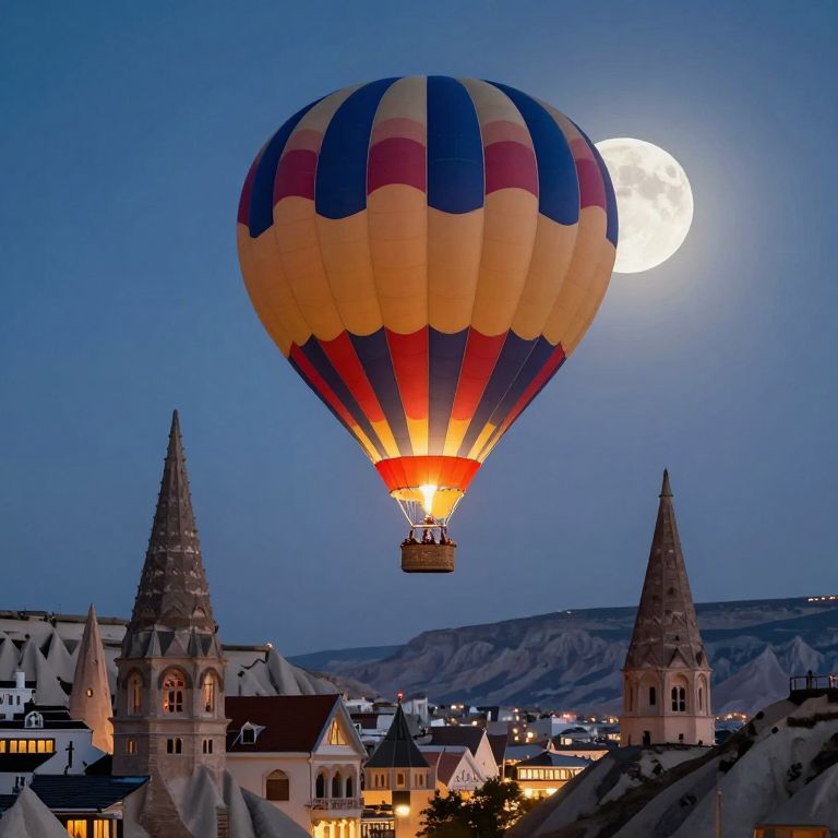 Suspended between the ethereal glow of moonlight and the whispers of ancient spires, a vibrant hot air balloon ascends over a city where architecture dances with gravity, embodying the timeless pursuit of freedom and the delicate balance of dreams and reality.
