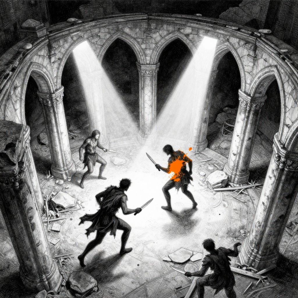 Create a captivating black-and-white artwork using a refined hand-drawn technique, The style should focus on intricate details, utilizing fine lines, soft crosshatching, and delicate gradients to bring depth and subtle texture to the scene, The atmosphere is minimalist yet immersive, evoking a sense of quiet wonder, introspection, and timeless beauty, The overall composition should feel balanced and harmonious, with an emphasis on simplicity and elegance, The mood is ethereal, slightly surreal, and contemplative, as though the subject exists in a dreamlike, weightless world, The artwork’s focus will be on a specific subject—A wide shot from above captures the crumbling, arched ruins and the violent clash below, as the combatants’ twisted forms move like phantoms, Their ragged clothes sway in the motion, knives reflecting stark beams of moonlight cutting through the decayed structure—rendered with precision and care to highlight its texture and organic qualities, Everything in the image should remain entirely black and white, except for one single element—such as a big orange ink splatter—which should be rendered in the specified color, adding a dynamic focal point to the composition, The colored element should contrast subtly yet strikingly with the monochrome surroundings, enhancing the overall impact and drawing the viewer's attention