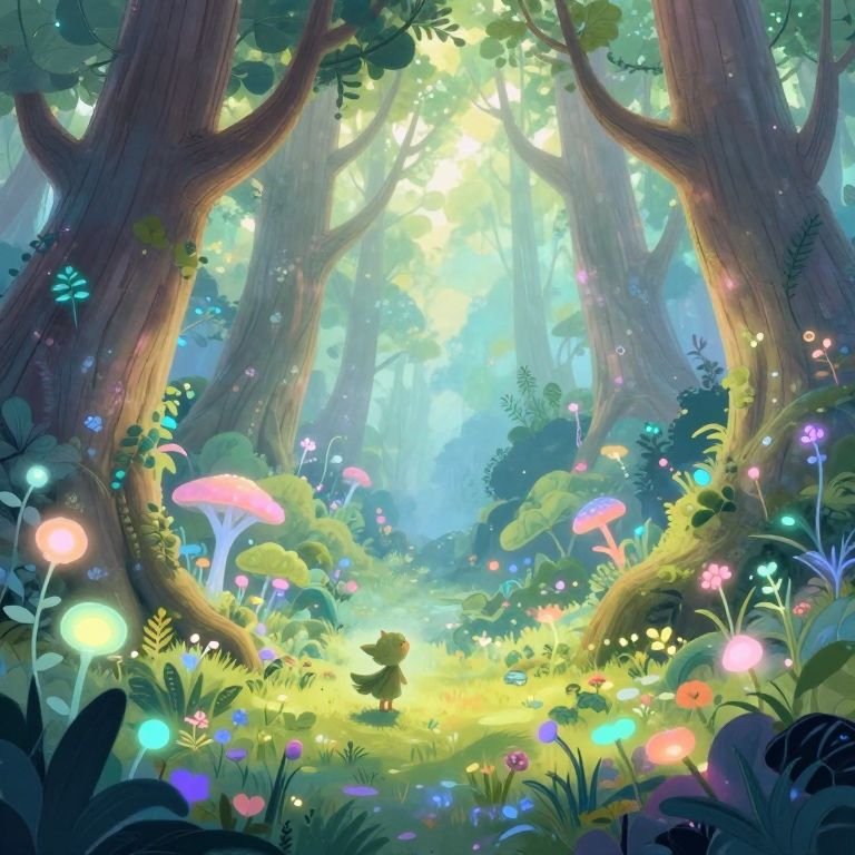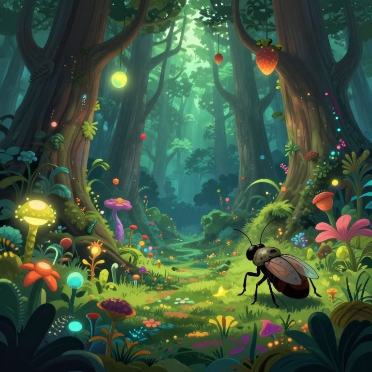 Envision an intricate digital art scene reminiscent of James Jean's narrative illustrations, portraying a surreal forest from an insect's first-person perspective. The ground teems with vibrant, pulsating plant life merging seamlessly with towering ancient trees reaching for luminescent \"fruits\" suspended above. Delicate interplay of light and shadow casts an enchanting ambiance, blending awe with unease as the viewer explores this mystical landscape filled with hidden mysteries waiting to be discovered.