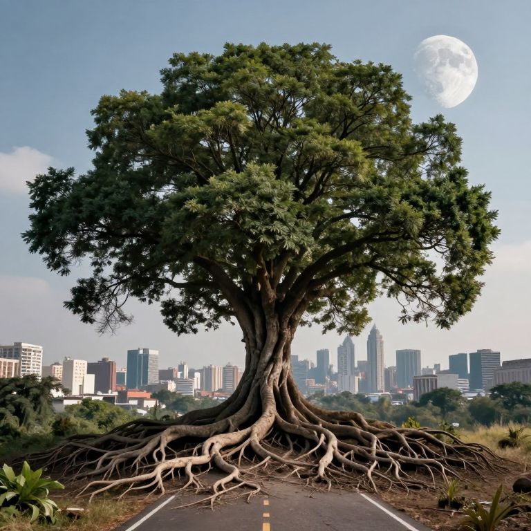A digitally enhanced photograph depicts a massive tree with sprawling roots extending across a paved road, leading into a cityscape. The tree's dense, green foliage contrasts with the clear, blue sky, where a full moon is prominently visible. The background features modern skyscrapers, adding an urban element to the natural scene. The road, marked by yellow lines, runs vertically through the center, emphasizing the tree's dominance. The image blends realism with surrealism, highlighting the tree's exaggerated size and intricate root system.