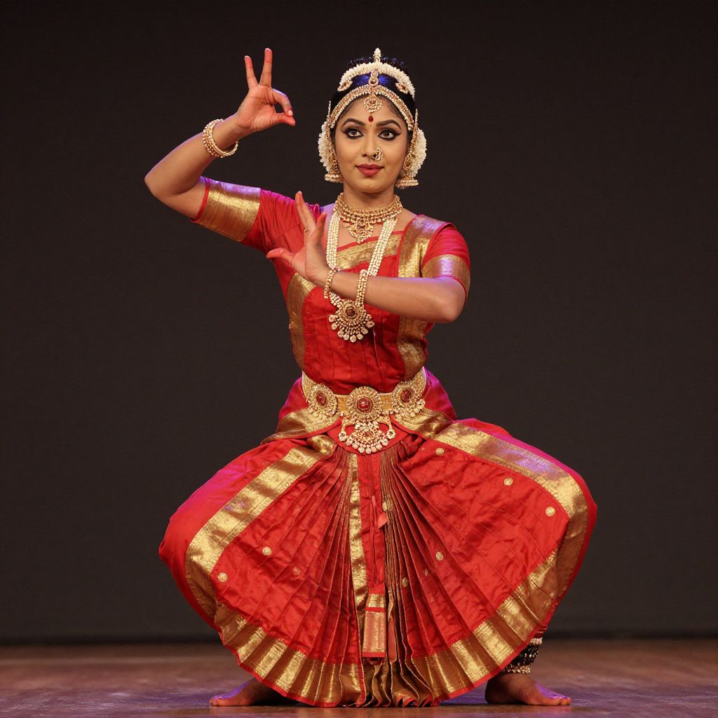 Photograph of a South Asian woman performing a traditional dance on a stage with a dark background. She is wearing a vibrant red sari with gold trim, adorned with intricate gold embroidery and a matching blouse. Her sari is pleated at the bottom, revealing gold fringe. She has dark hair styled in a bun, decorated with a gold headpiece and jewelry, including a necklace, earrings, and bangles. She is in a squatting position, with her right hand raised and her left hand resting on her knee, making a traditional dance gesture. Her expression is focused and graceful.