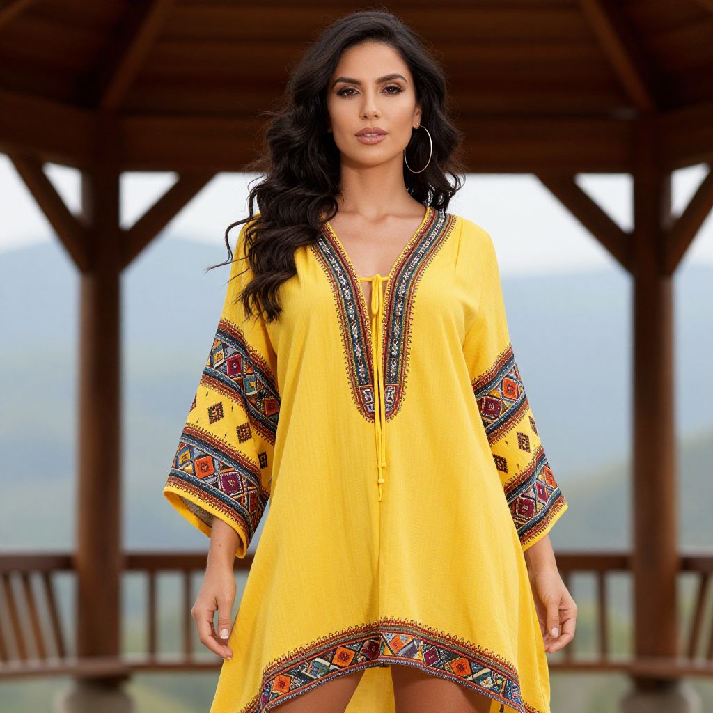 Photograph of a beautiful woman with long, wavy dark brown hair standing in a sunny garden. She's wearing a colorful, embroidered crop top and matching mini skirt with black fringe details. Her skin is tan, and she has hoop earrings. The background features palm trees and vibrant orange flowers. She looks directly at the camera with a confident expression.