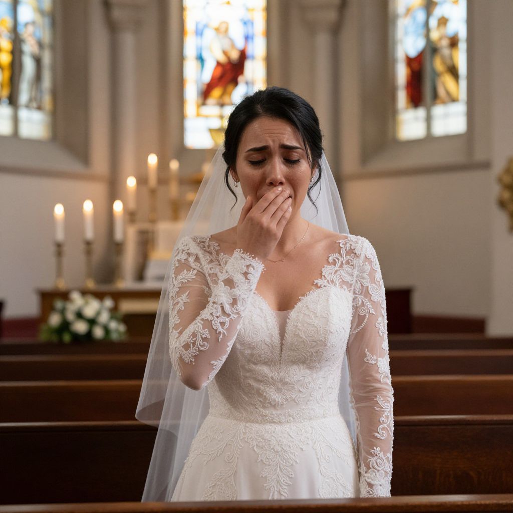 Photograph of a distraught bride standing in a church. She has dark hair in a loose updo, wears a white lace wedding dress with long sleeves, and a sheer veil. Her right hand is raised to her mouth, covering her expression of sadness. The church background features stained glass windows, a wooden altar with white candles, and a bouquet of white flowers. The lighting is warm, highlighting the emotional moment. The bride's fair skin contrasts with her dark hair and the white lace of her dress.