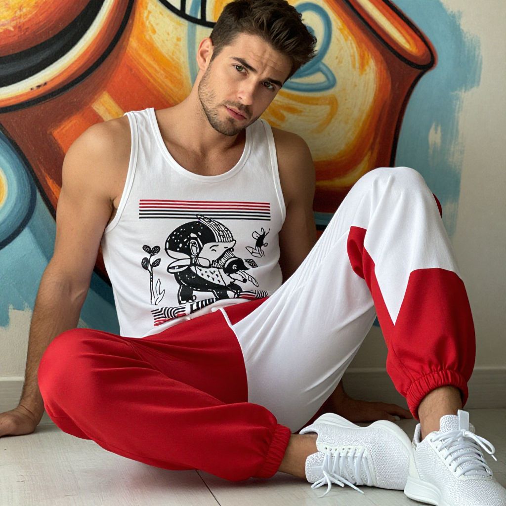A man, graphic tank top, loose-fitting jogger pants, bold red and white color contrast, lightweight training shoes, vibrant murals, soft natural light, relaxed expression, casual vibe. Man has masculine face and piercing eyes