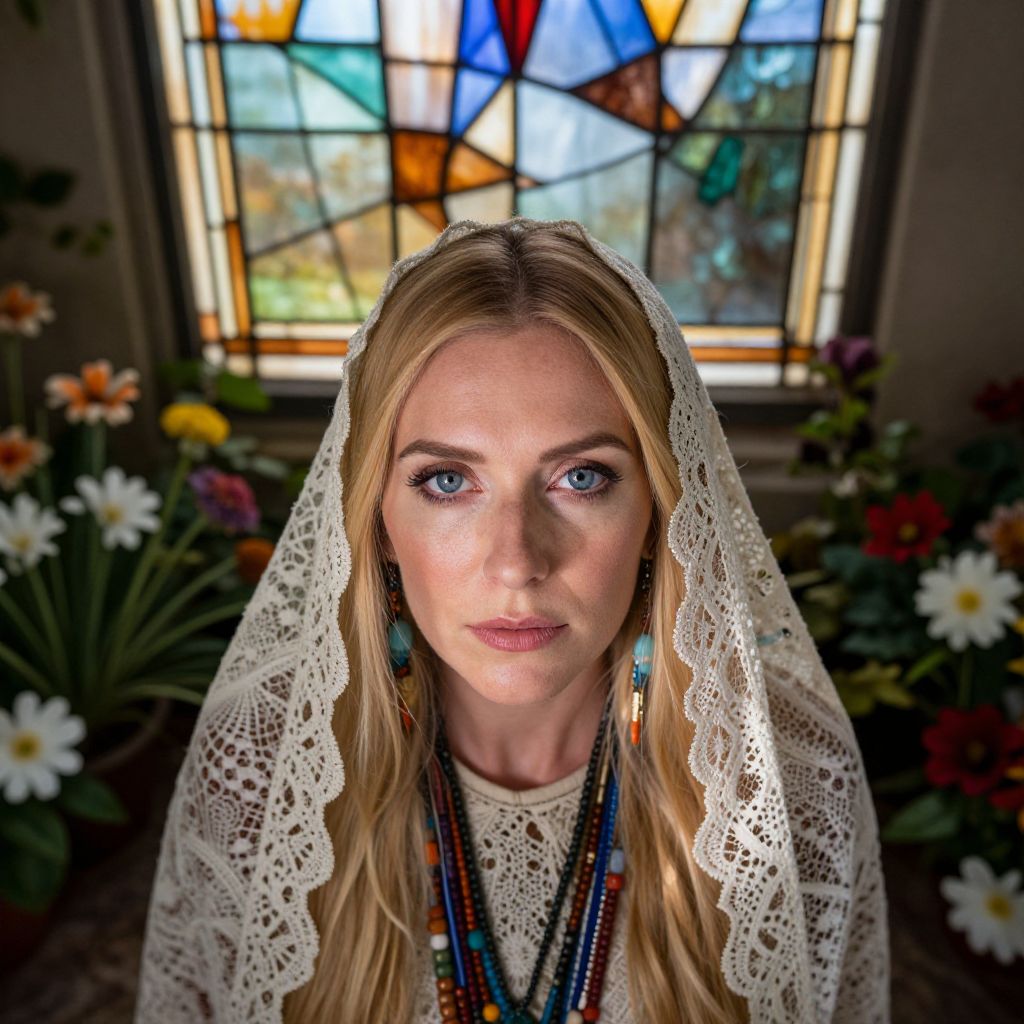 A photorealistic portrait photograph captures an enigmatic Native American woman with piercing blue eyes and golden blonde hair, her serene gaze drawing viewers in from a unique aerial perspective. Soft, diffused light filters through a stained-glass window, casting intricate patterns on her fair skin and highlighting the delicate texture of her lace veil. Surrounded by a lush garden filled with vibrant blossoms and verdant foliage, she exudes an air of quiet contemplation that invites shared introspection amidst natural beauty.