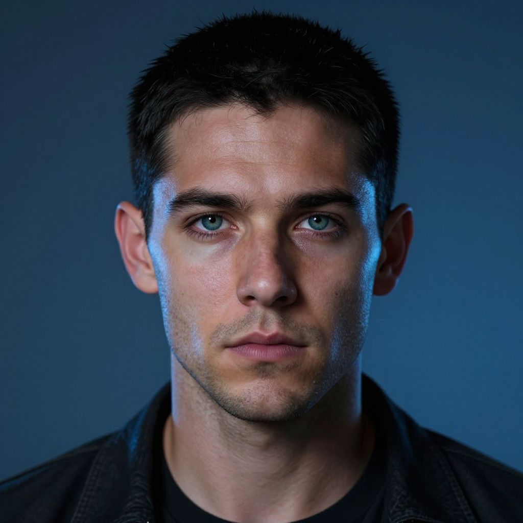A photograph of a muscular Caucasian man with short, dark brown hair and light skin, crouching on a grassy field under a bright blue sky with white clouds. He is wearing a black t-shirt, black shorts, and black athletic shoes. His right hand is on the ground, and his left hand rests on his left knee. The grass is lush and green, and the man's intense gaze is directed at the camera. The image has a slightly HDR effect, enhancing the colors and contrasts.