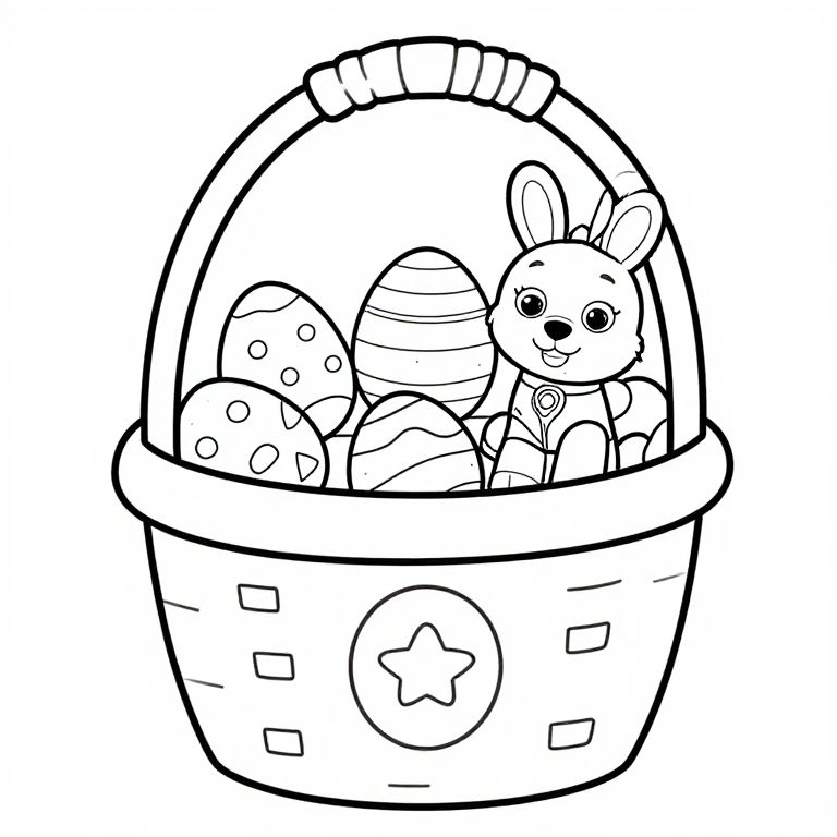 Black-and-white line drawing of a basket containing a bunny and polka-dotted eggs, with a star on the basket.