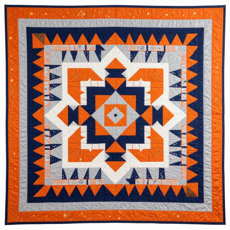 Vibrantly patterned memory quilt featuring a central geometric design surrounded by layered borders of orange, gray, and navy blue triangles, showcasing intricate details and cultural motifs.